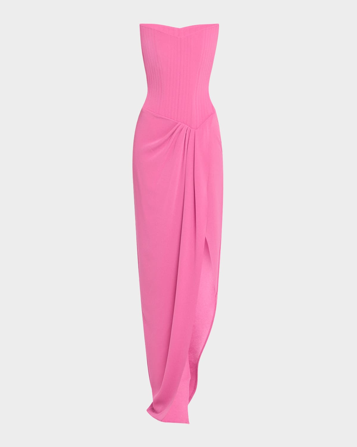 Alex Perry crepe gown featuring a corset bodice and an asymmetric skirt with waist gathering Strapless neckline Sleeveless Sheath silhouette Highlow hem; side slit Invisible back zip Triacetate/spandex Fully lined Dry clean Imported