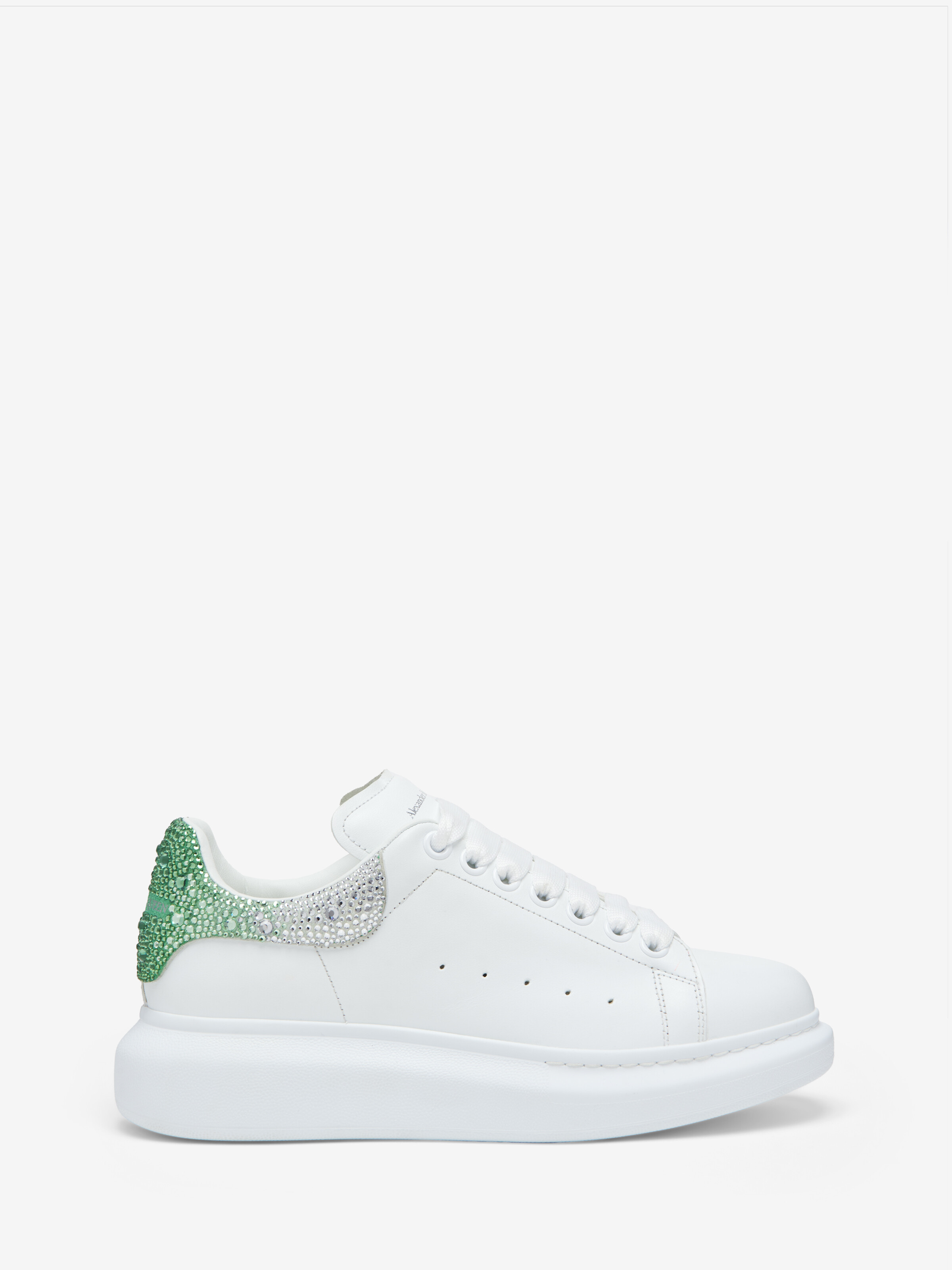 The oversized sneaker - statement silhouette in white calf leather, with a gradient green crystal-embellished heel counter featuring the mcqueen signature. Finished with a chunky rubber sole.