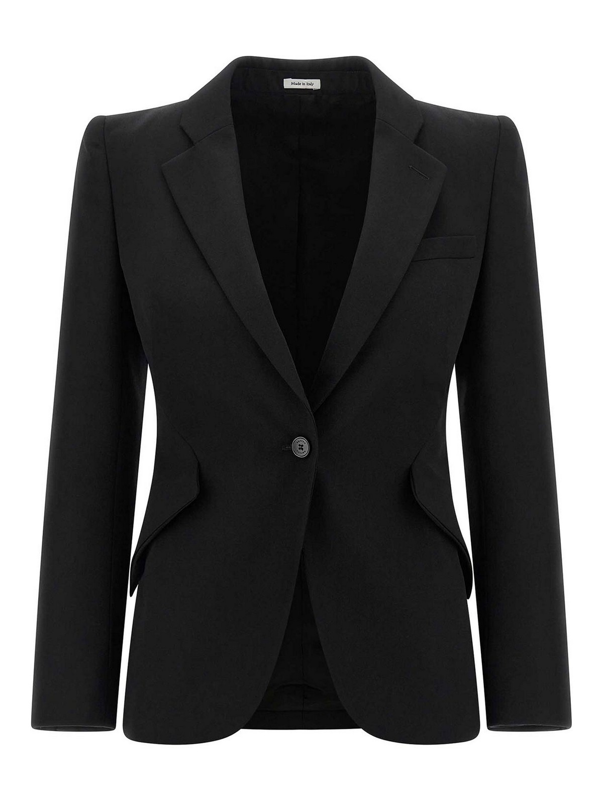 Blazer simple à boutonnage en grain de poudre à silhouette en sablier avec boutons et revers miroir, poche poitrine, poches à rabat inclinées, épaules rembourrées légèrement pointues, manches longues, fentes latérales