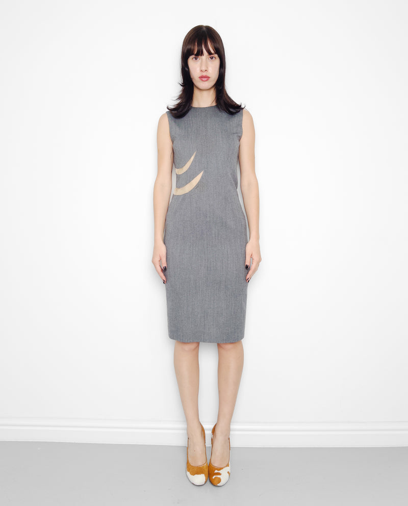 Alexander McQueen F/W1998 grey wool dress with sheer nude "slashed" side panels. The dress has a nude nylon lining underneath.