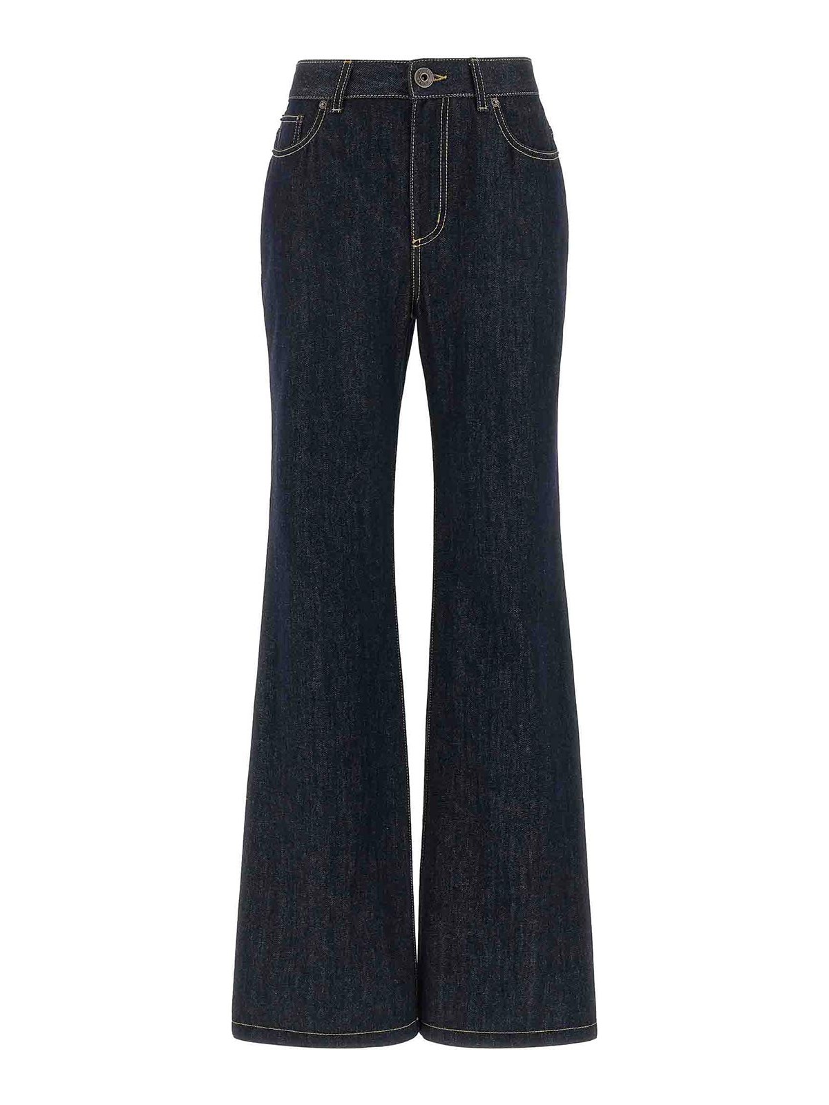 Jean en denim de coton avec surpiqûres, jambe droite légèrement évasée, fermeture éclair et bouton, cinq poches, étiquette logo au dos