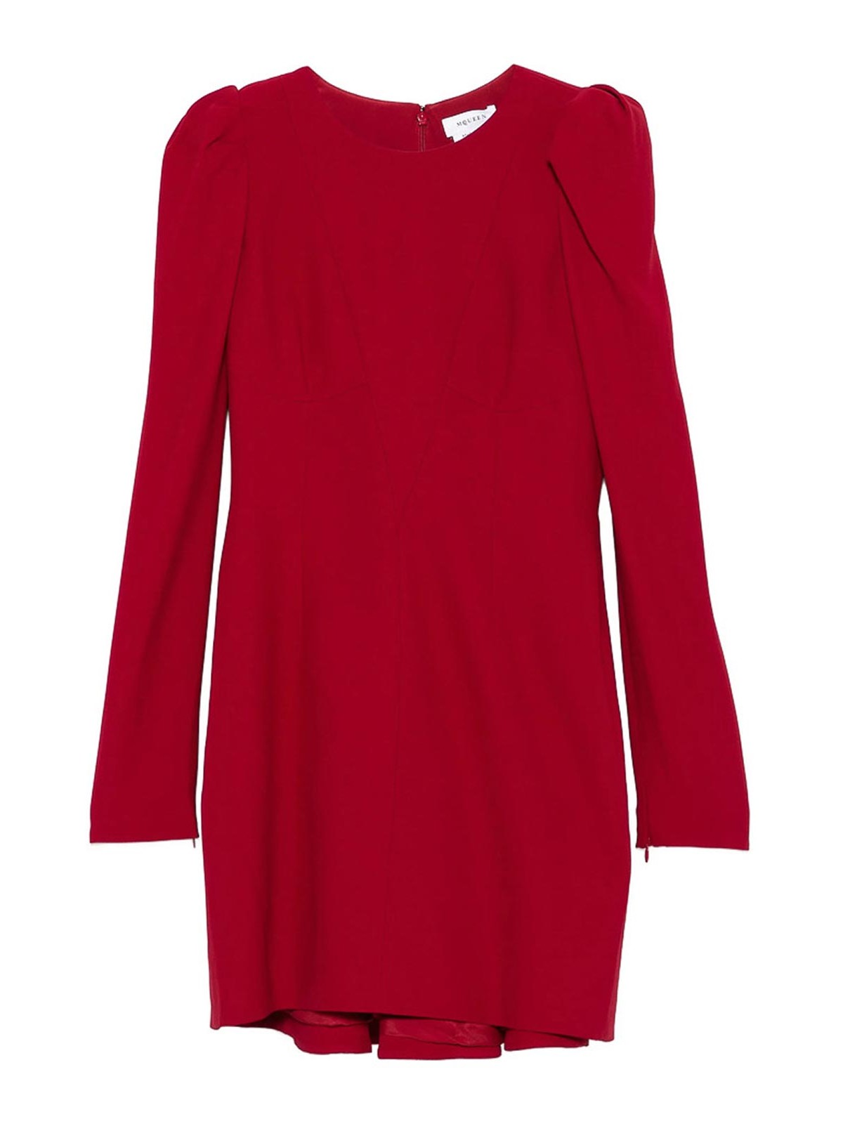 Corsage cintré rouge à manches bouffantes, fermeture éclair dissimulée, ourlet droit, jupe trapèze