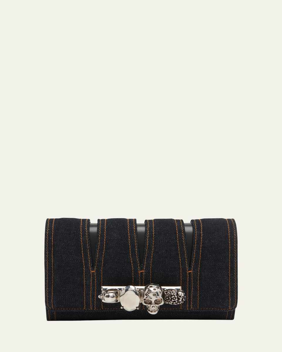 Alexander McQueen "The Slash" clutch bag in denim cotton and leather Features signature skull and jewel knuckle duster Removable chain crossbody strap Can be worn as a clutch or crossbody bag Flap top with snap closure Interior, two slip pockets Approx. 6"H x 9"W x 6.3"D Made in Italy