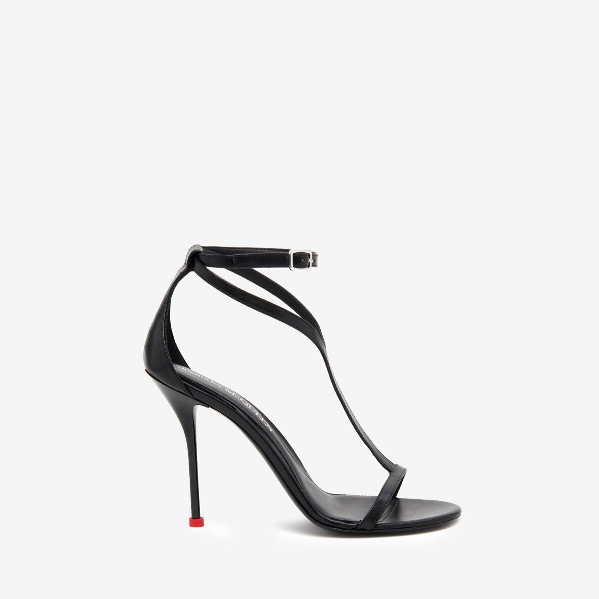 Lust red leather naked sandal featuring a round toe silhouette and a T-bar upper inspired by the iconic harnesses of the House. The sandal is finished with a tonal lacquered pin heel and signature lust red heel tip.