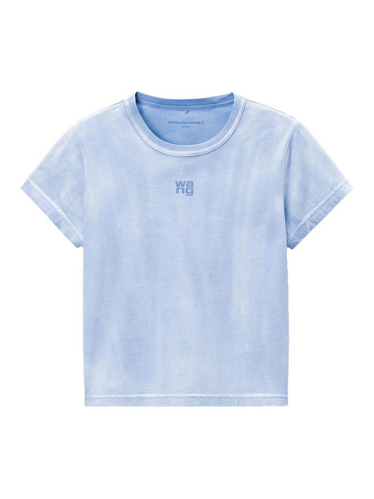 Logo à col rond délavé à texture bleu pâle imprimé sur les manches courtes et ourlet droit