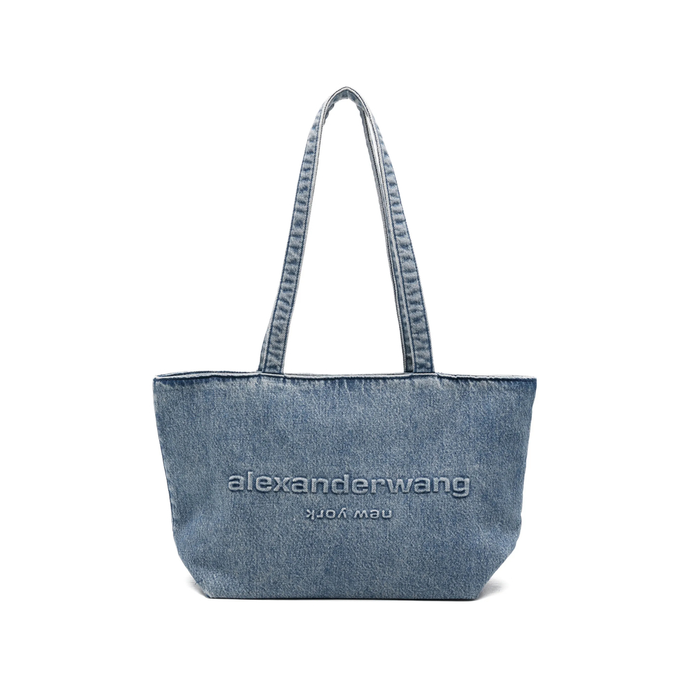 blue embossed logo top flat handles top zip fastening