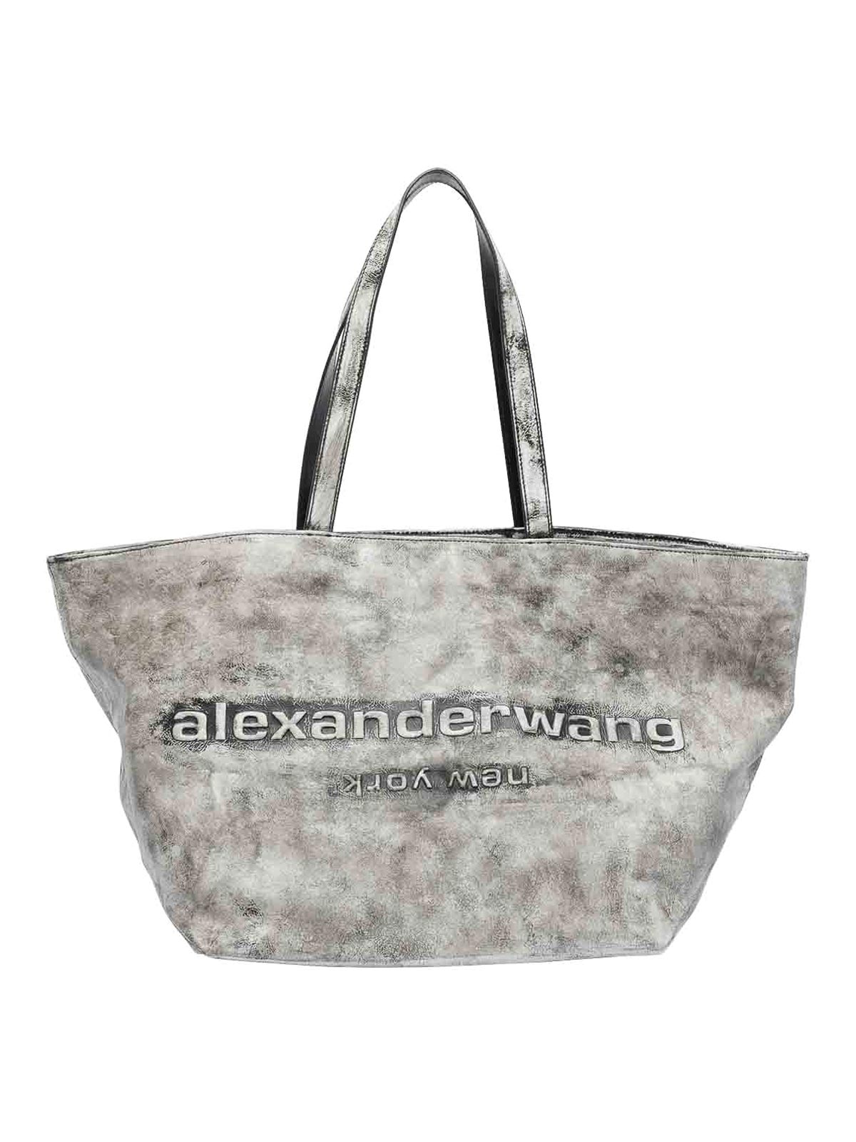 Sac fourre-tout Alexander Wang gris clair avec poche zippée en coulisse, poches ouvertes, bretelles, logo frontal, nom de la couleur du créateur: gris