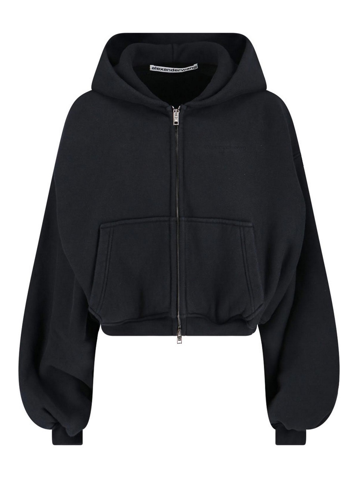 Zip Cropped Alexander Wang, en coton noir, capuche, manches ballon, fermeture à double zip, deux poches latérales, finitions côtelées, ourlet droit.