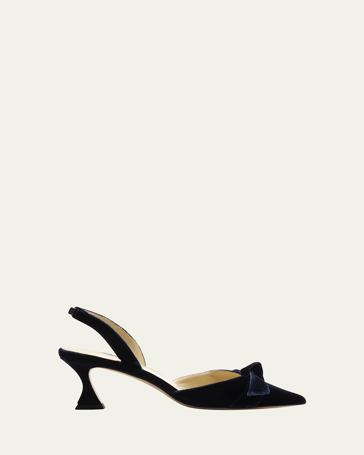 Meticulously crafted with a plush velvet upper, the "Clarita Bell" pumps by Alexandre Birman are adorned with a signature DNA knot for an elegant finish 2.36 in / 60 mm architectural heel Pointed toe Elastic slingback strap Leather lining and outsole Professional cleaning recommended Made in Italy