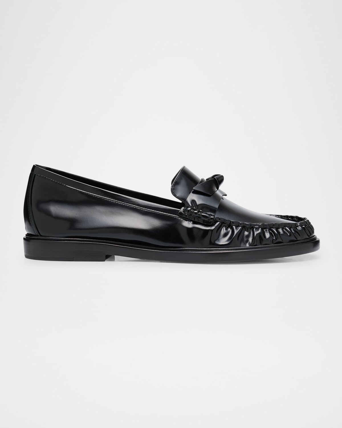 Alexandre Birman "Clarita" handcrafted penny loafer that exudes timeless sophistication and modern innovation. Crafted from semishine leather, these shoes offer a refined, understated elegance. What sets them apart is the infusion of our DNA, featuring a cutout laser Clarita design gracefully shaped in the center, adding a unique and captivating touch to this classic style. Finished by carefully crafted handmade stitches for a clean look. 1.00 in / 25 mm flat heel Round moc toe Notched vamp with bow accent Slipon style Leather outsole Lining: Leather Spot clean Made in Brazil