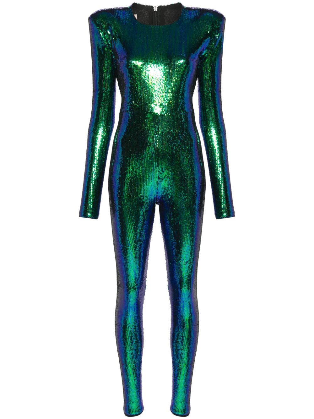 green/blue sequin embellishment round neck shoulder pads long sleeves full lining tapered leg concealed rear zip fastening
