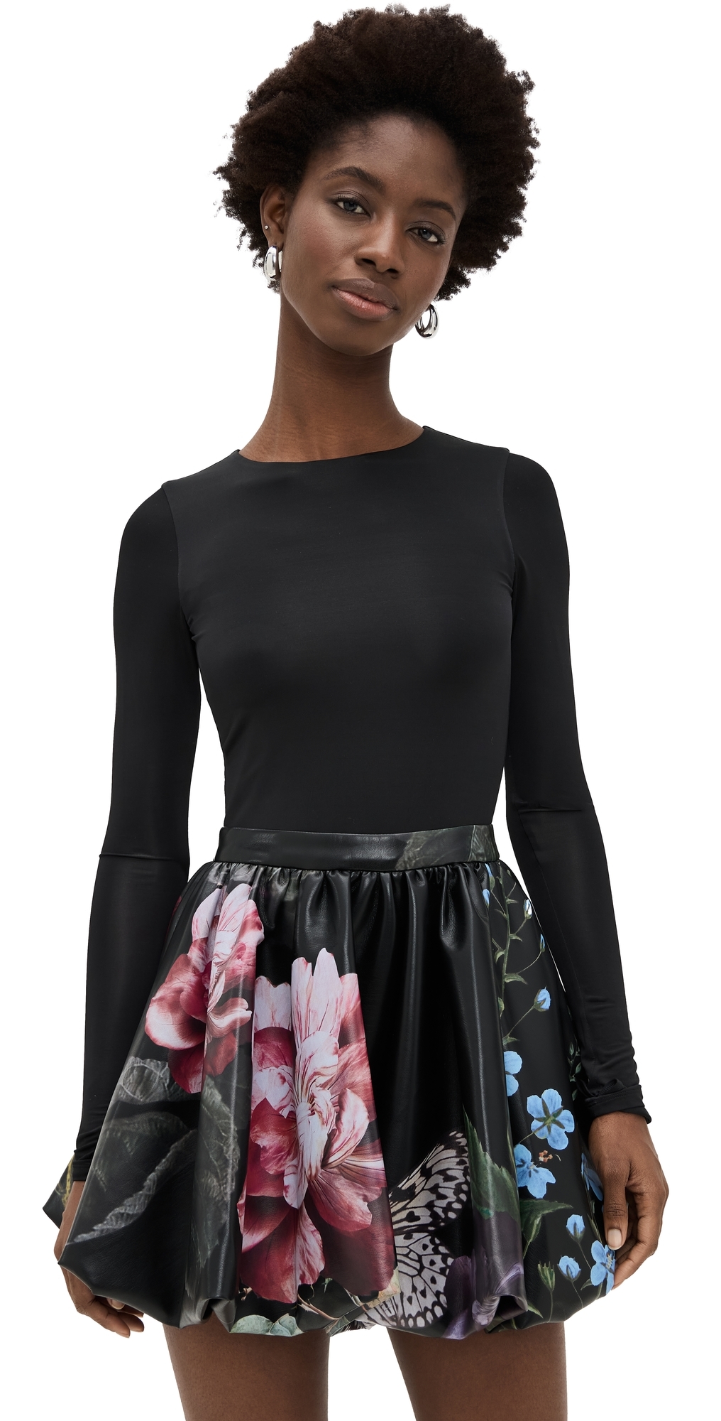 Fabric: Mid-weight, non-stretch faux leather. Faux leather bubble hem with floral print. Slinky jersey bodice and sleeves. Crew neck. Long sleeves with thumbhole cuffs. Hook-and-eye and zip at back. On-seam side pockets. Shell: 100% polyurethane. Trim: 93% viscose/7% elastane. Unlined bodice, lined skirt. Hand wash or dry clean. Imported, China. Measurements: Measurements from size XS Length: 31.5in / 80.0cm, from shoulder