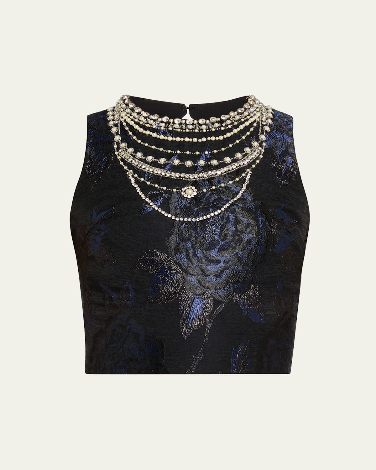 Made from structured, floral jacquard, the "Cherra" top by Alice + Olivia features an embellished neckline that gives the illusion of layered necklaces Approx. 17"L from shoulder to hem Crew neckline Sleeveless Open back Fitted Cropped hem Center back zipper Polyester/cotton Lining: Recycled polyester Imported