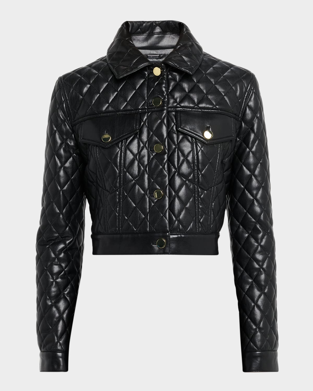 Crafted of faux leather (PU/polyester), the "Chloe" jacket from Alice + Olivia features a diamondquilted finish and contrasting goldtone buttons Approx. 18.5"L from shoulder to hem Spread collar; button front Long sleeves with button cuffs; approx. 32"L Buttoned chest flap pockets Yoked back Slim fit Cropped hem Polyurethane/polyester Lining: Recycled polyester Dry clean Imported