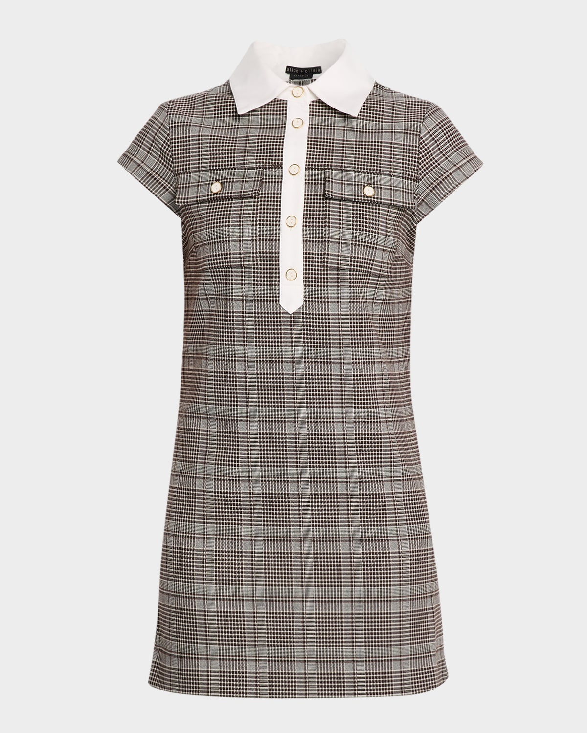 The "Darby" shirtdress by Alice + Olivia boasts a classic plaid pattern with a contrasting collar and placket for a polished, everyday silhouette Approx. 33"L from shoulder to hem Spread collar; partial button front Short sleeves; approx. 11.5"L Buttoned chest flap pockets Hem falls above the knee Shift silhouette Slipover style Polyester/viscose/elastane Unlined Dry clean Imported