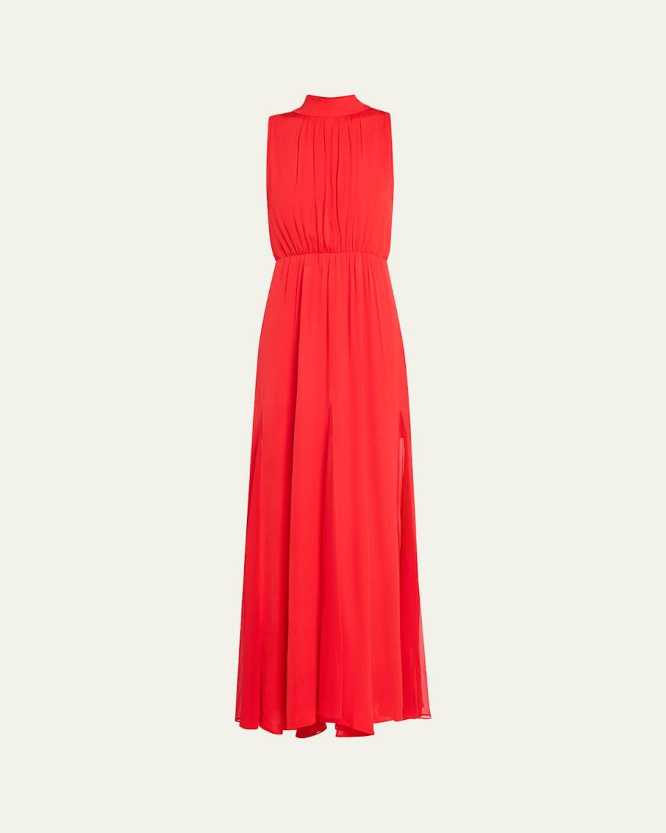 Alice + Olivia "Dita" solid double viscose dress detailed with godetpleating through the skirt Approx. 59"L from shoulder to hem High neckline; selfties behind the neck Sleeveless Draped cowl back Full length Viscose/polyester Lining: Recycled polyester/elastane Dry clean Imported