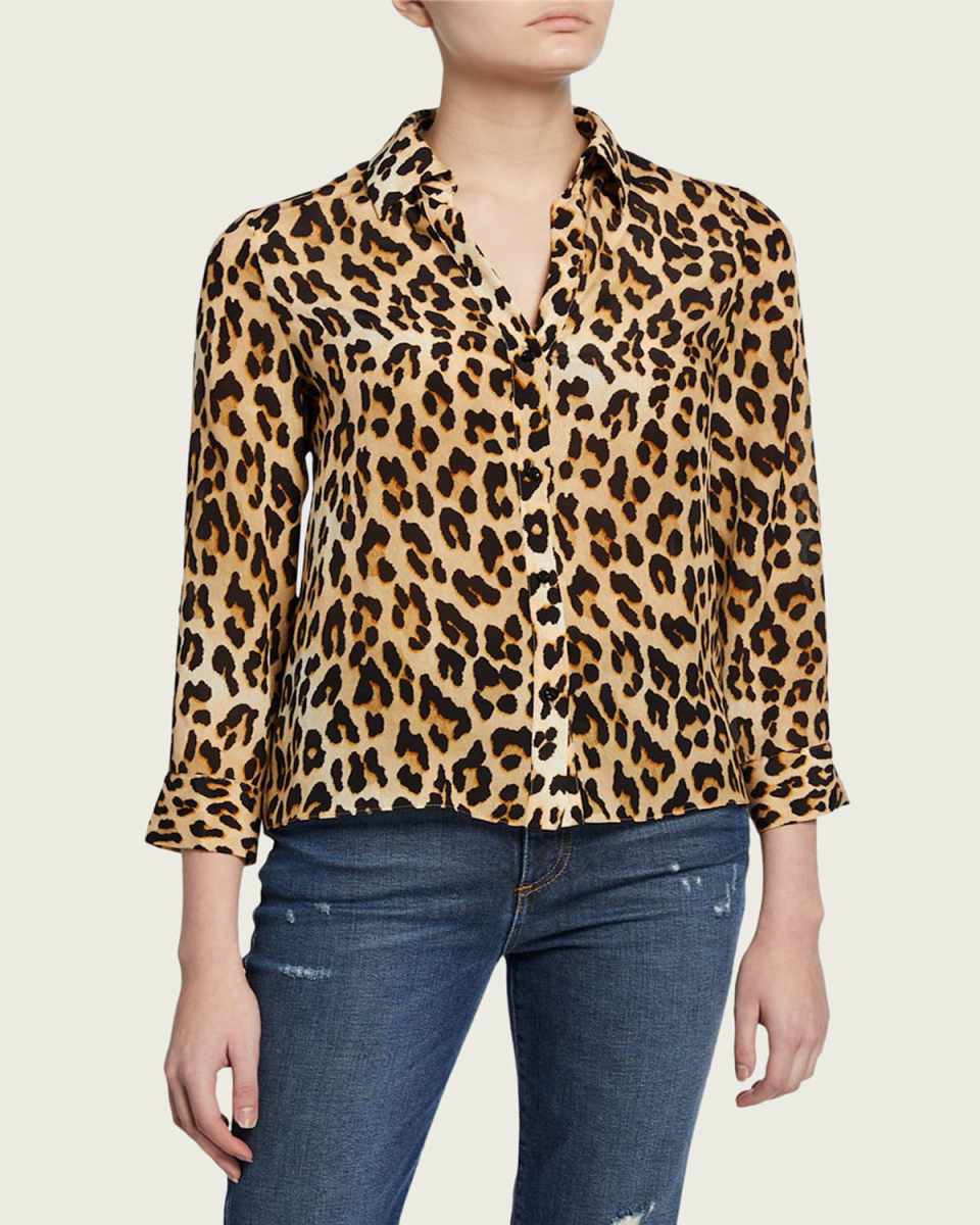 Alice + Olivia "Eloise" leopardprint blouse. Approx. 25"L down center back. Collared V neckline; button front. Bracelet sleeves; button cuffs. Relaxed fit. Yoked back; box pleat. Straight hem. Hip length. Silk. Imported.