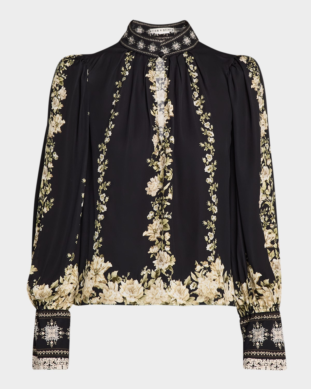 Outlined with a romantic floral print, the "Marion" blouse by Alice + Olivia is crafted from lustrous satin for a fluid drape Approx. 22"L from shoulder to hem Collared split neckline; button front Lightly puffed shoulders Long sleeves with button cuffs; approx. 31.5"L Relaxed fit Hip length Viscose Lining: Recycled polyester Dry clean Imported
