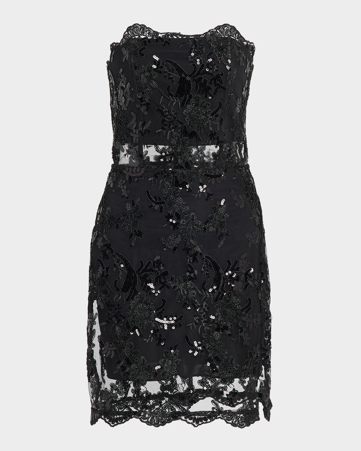 Intricately handembroidered with sequins on a floral lace base for added depth and shimmer, the "Georgie" dress by Alice + Olivia consists of a fitted bodice and an abbreviated hemline Approx. 33"L from shoulder to hem Strapless neckline Sleeveless Hem falls above the knee Bodycon fit Center back zipper Polyester Lining: Recycled polyester Imported