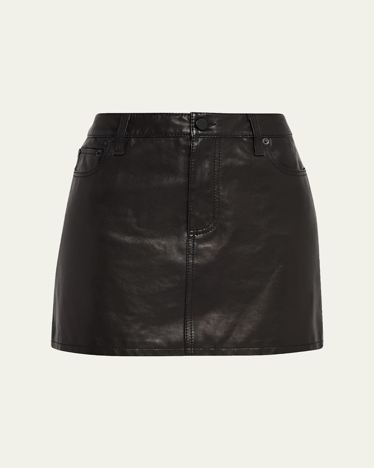 An edgy wardrobe staple, the "Joss" mini skirt by Alice + Olivia is rendered in premium goatskin leather High rise Fivepocket style Hem falls above the knee Skirt falls straight from hip to hem Button/zip fly; belt loops Leather Lining: Recycled polyester Imported