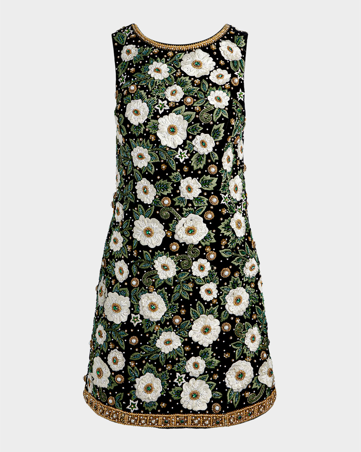 Intricately embroidered with floral detailing on a velvet base, the "Lindsey" gown by Alice + Olivia features an abbreviated length to show off your legs Approx. 33"L from shoulder to hem Crew neckline Sleeveless Hem falls above the knee Bodyskimming silhouette Center back zipper Polyester Lining: Polyester Dry clean Imported