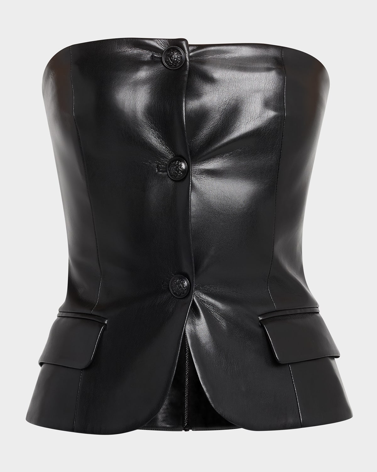Crafted from luscious vegan leather (PU/polyester), the "Madison" bustier top by Alice + Olivia features blazerinspired tailoring and tonal embossed buttons Approx. 21.5"L from shoulder to hem Strapless neckline Sleeveless Slim fit Hip length Center back zipper Polyurethane/polyester Lining: Recycled polyester Imported