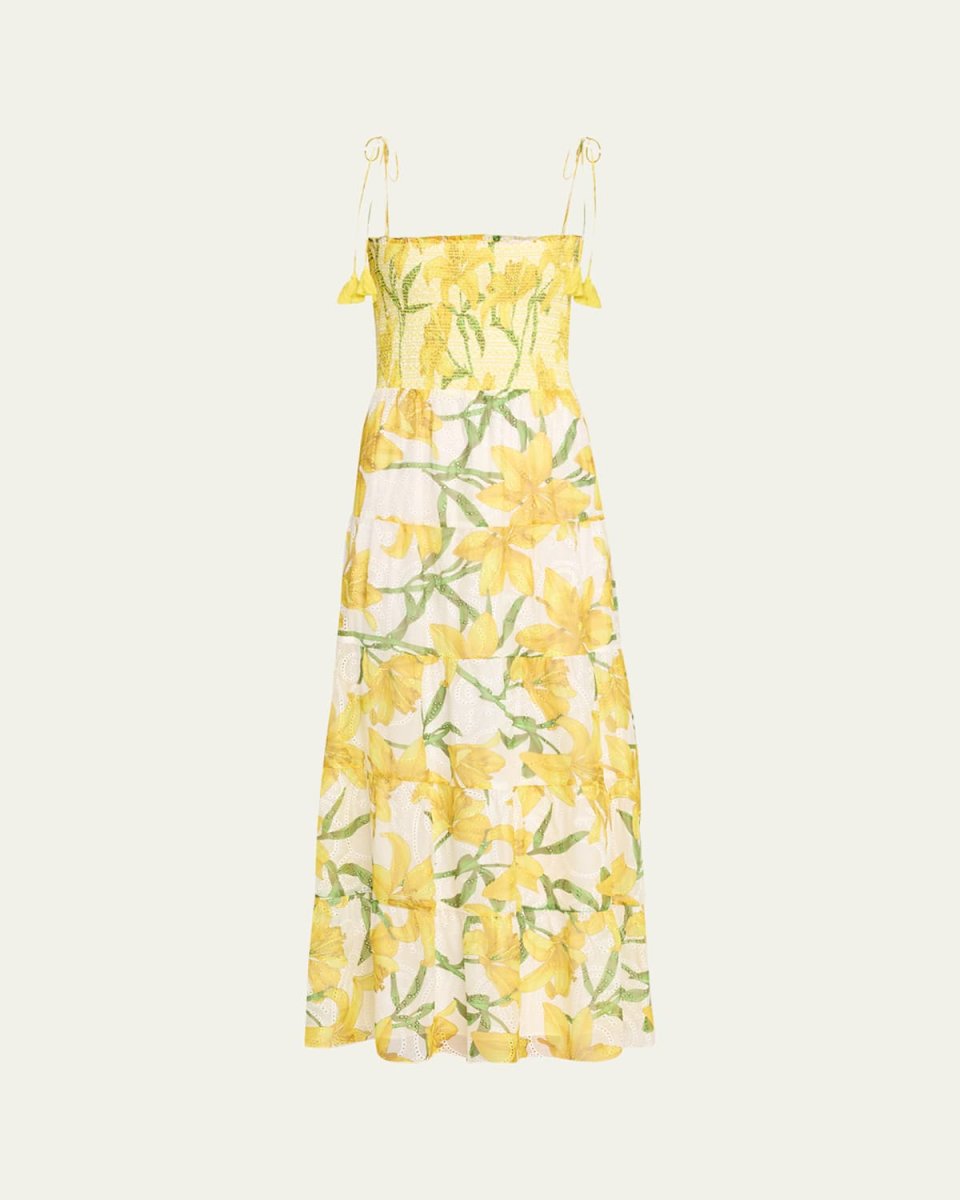 Alice + Olivia "Marna" dress printed with lovely floral blooms features a smocked bodice and intricate eyelet embroidery Square neckline Selftie shoulder straps with tassel ends Full length Tiered skirt Exposed back zipper Polyester Lining: Recycled polyester/elastane Imported