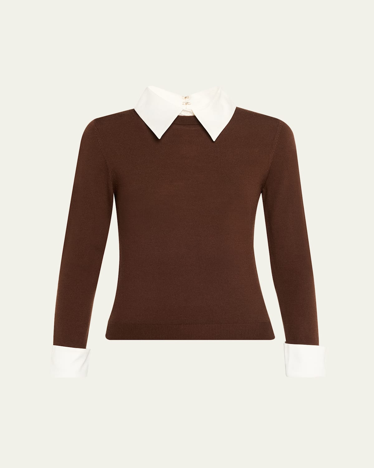 Accented with a contrasting collar and cuffs, the "Porla" top by Alice + Olivia features tiny, embroidered hearts at the cuffs for a subtle nod to "wearing your heart on your sleeve." Approx. 21"L from shoulder to hem Detachable woven collar Long sleeves; approx. 29.5"L Slim fit Hip length Ribbed hem Back zipper closure Wool/elastane Unlined Dry clean Imported
