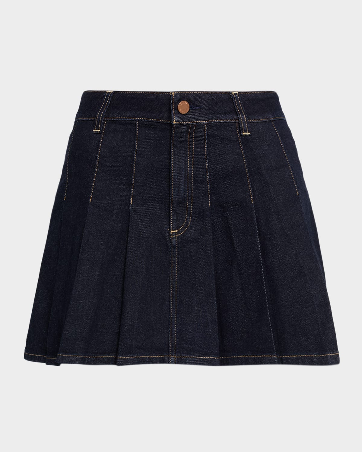 Finished with crisp pleats for an added texture, the "Suzie" skirt by Alice + Olivia is crafted from darkwash denim for a fresh update to the classic preppy silhouette High rise Hem falls above the knee Aline silhouette Button/zip fly; belt loops Cotton/elastane Unlined Dry clean Imported