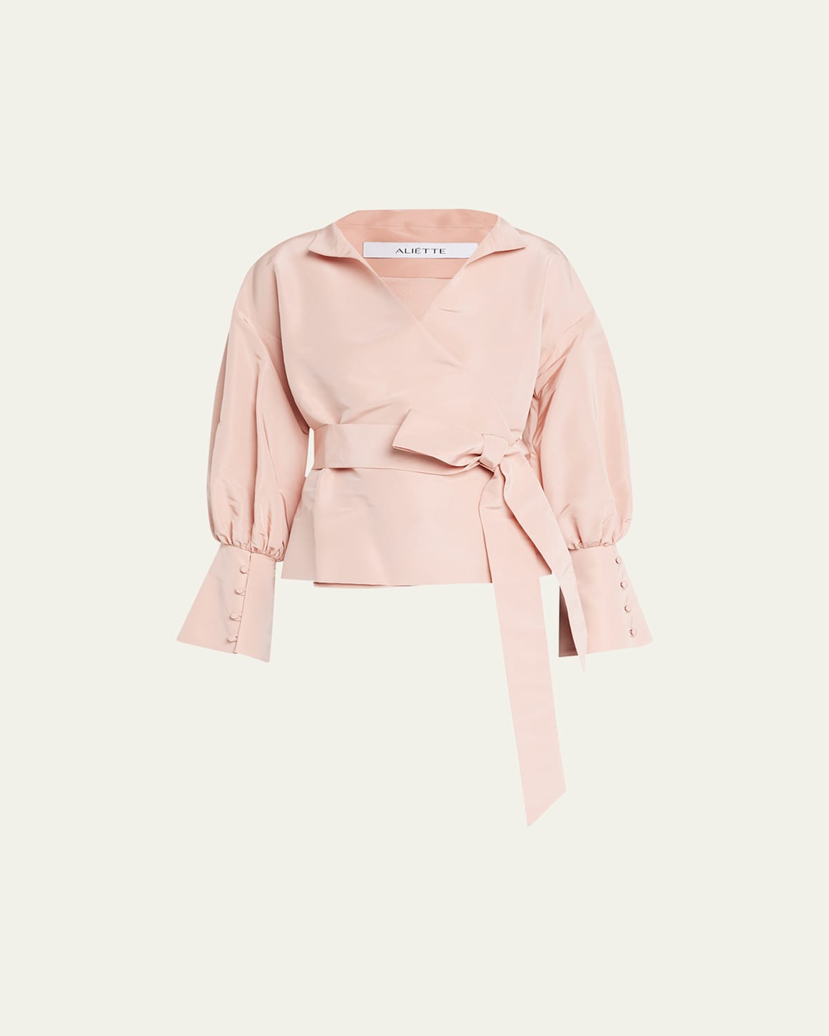 Aliette "Faille" silk jacket featuring tie detailing at the waist Stand collar 3/4 blouson sleeves; button cuffs Relaxed fit Hiplength hem Silk Made in the USA