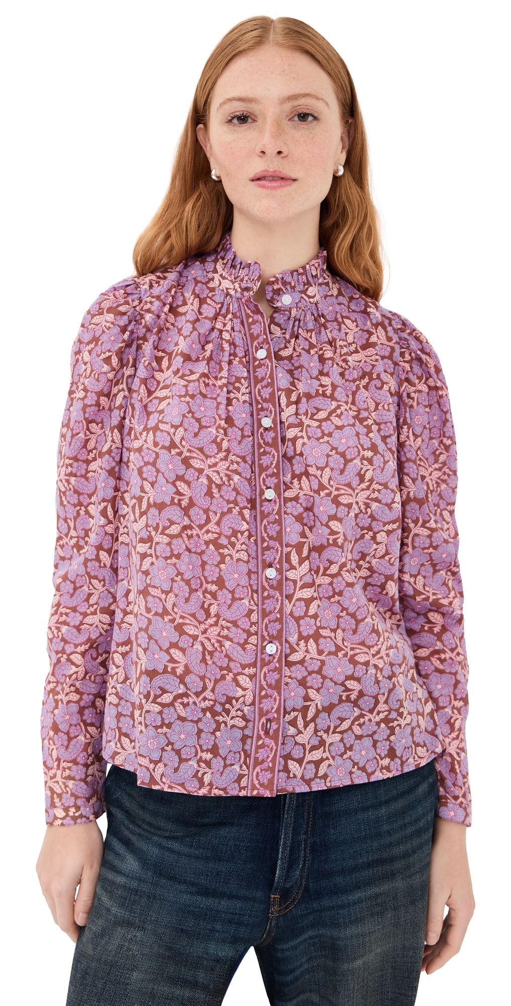 Fabric: Lightweight, non-stretch plain weave. Floral and paisley print. Ruffled trim at neck. Gathered neck and shoulders. Split hem at sides. Crew neck. Long sleeves with button cuffs. Button placket. Shell: 100% cotton. Hand wash. Imported, India. Measurements: Measurements from size S Length: 24.75in / 63.0cm, from shoulder