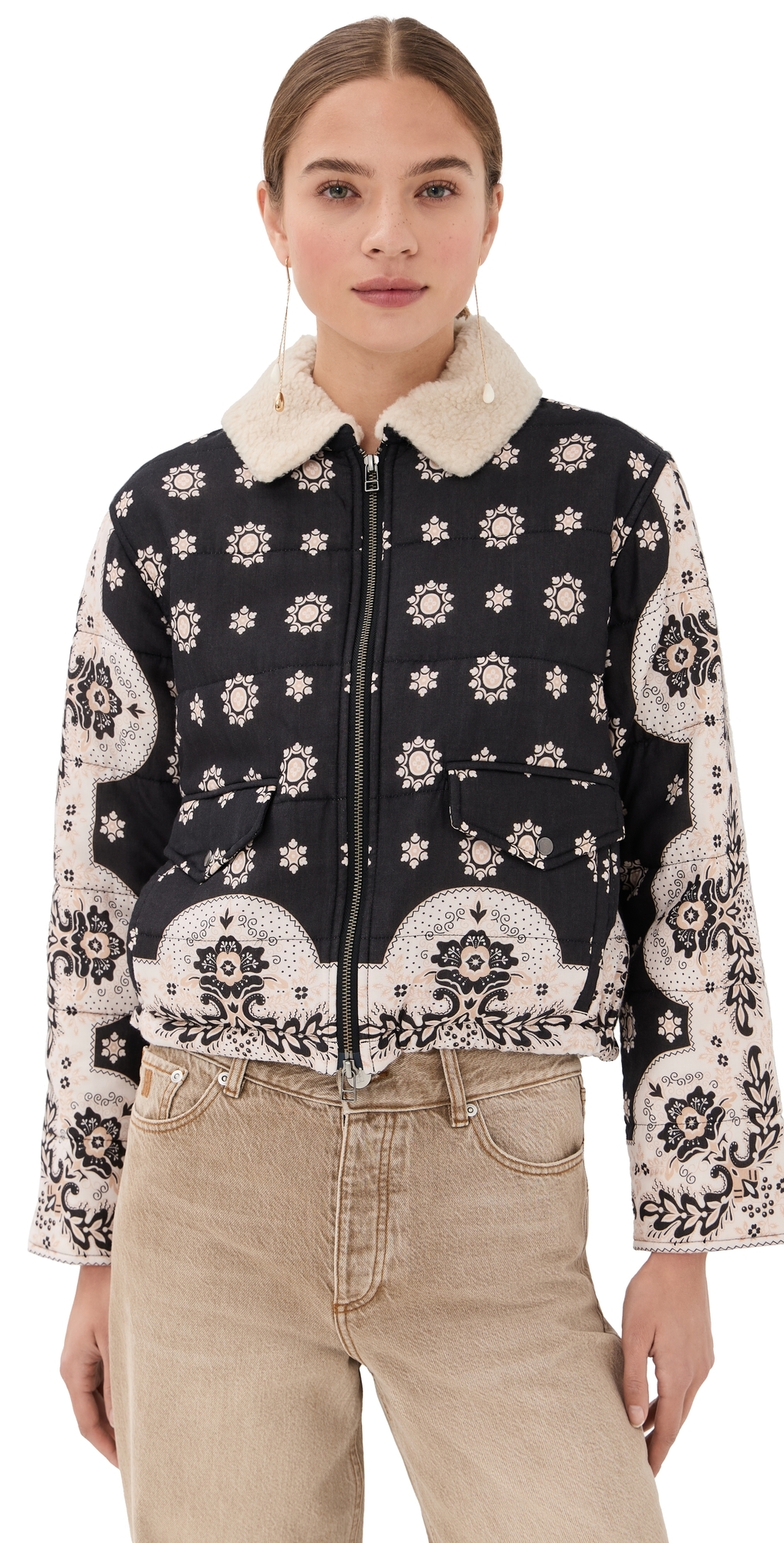 Fabric: Mid-weight, non-stretch plain weave. Sherpa trim. Botanical print. Collared neck. Long sleeves. Two-way zip closure. Drawstring waist. Flap and welt front pockets. Shell: 100% lyocell. Trim: 100% wool. Lined. Lining: 75% cotton/25% silk. Dry clean. Imported, India. Measurements: Measurements from size S Length: 21.25in / 54.0cm, from shoulder