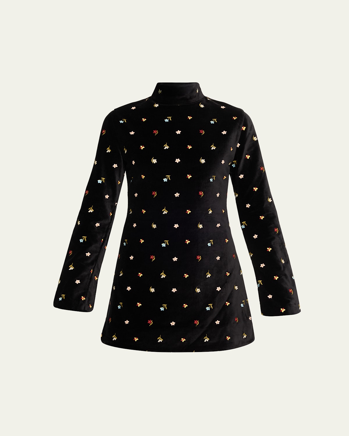 Alix of Bohemia "Romy" velvet mini dress accented with floral embroidery throughout Mock neckline Long sleeves Slim silhouette Hem falls above the knee Center back zip Cotton/silk Lining: Cotton/silk Dry clean Imported