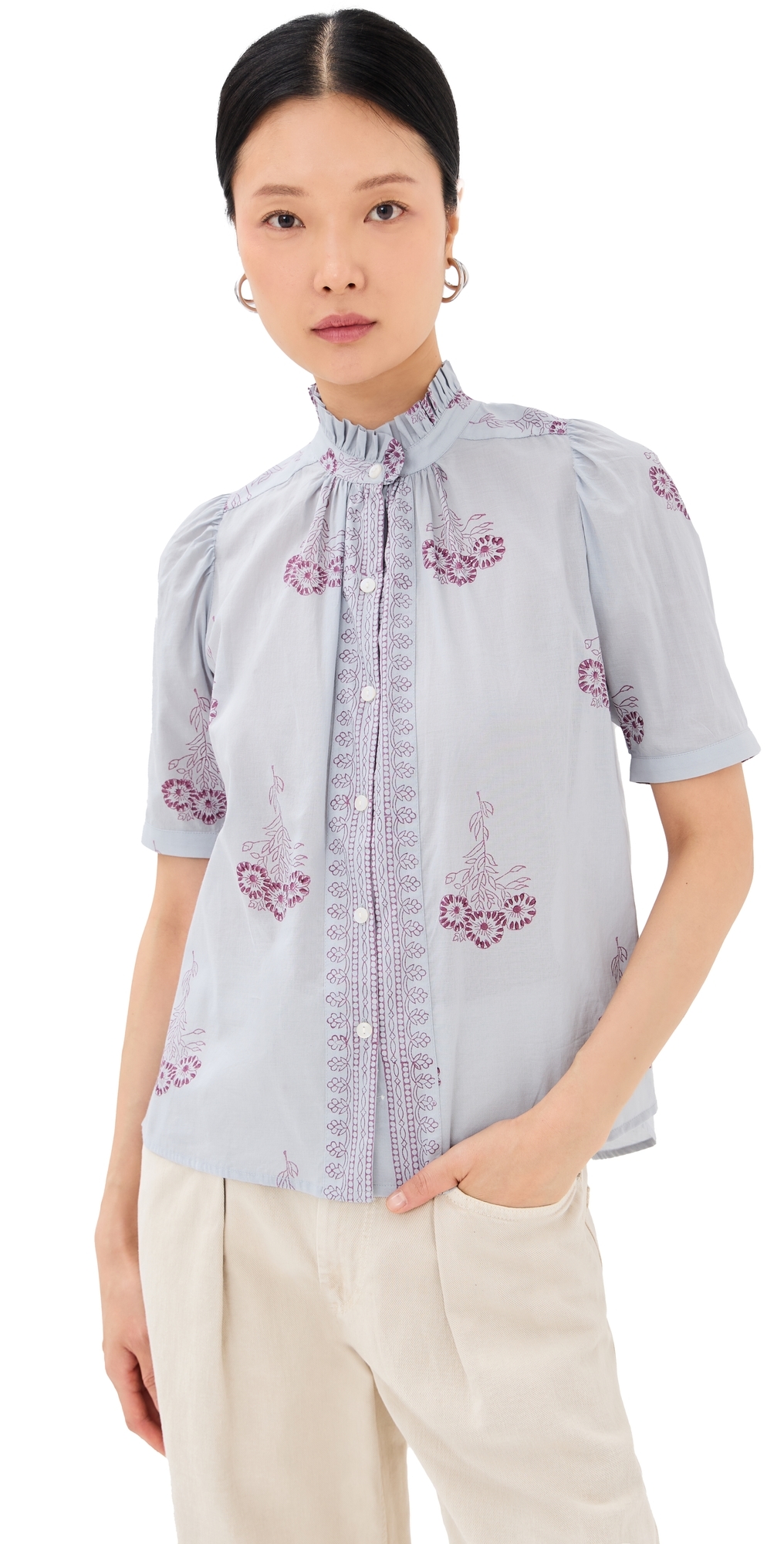 Fabric: Lightweight, non-stretch weave. Woodblock floral print. Mock neck. Short puff sleeves with button cuffs. Button placket. Shell: 100% cotton. Dry clean. Imported, India. Measurements: Measurements from size S Length: 22.75in / 58.0cm, from shoulder