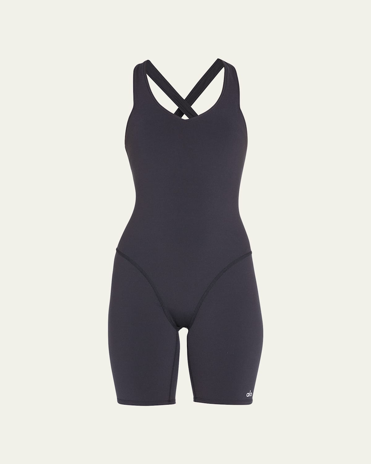 Alo Yoga "Real" onesie in sculpting Airbrush fabrication features Frenchcut seaming Provides light to medium support V neckline Shelf bra lining Crisscross back straps Secondskin fit Stepin style Sleeveless Nylon/spandex Imported