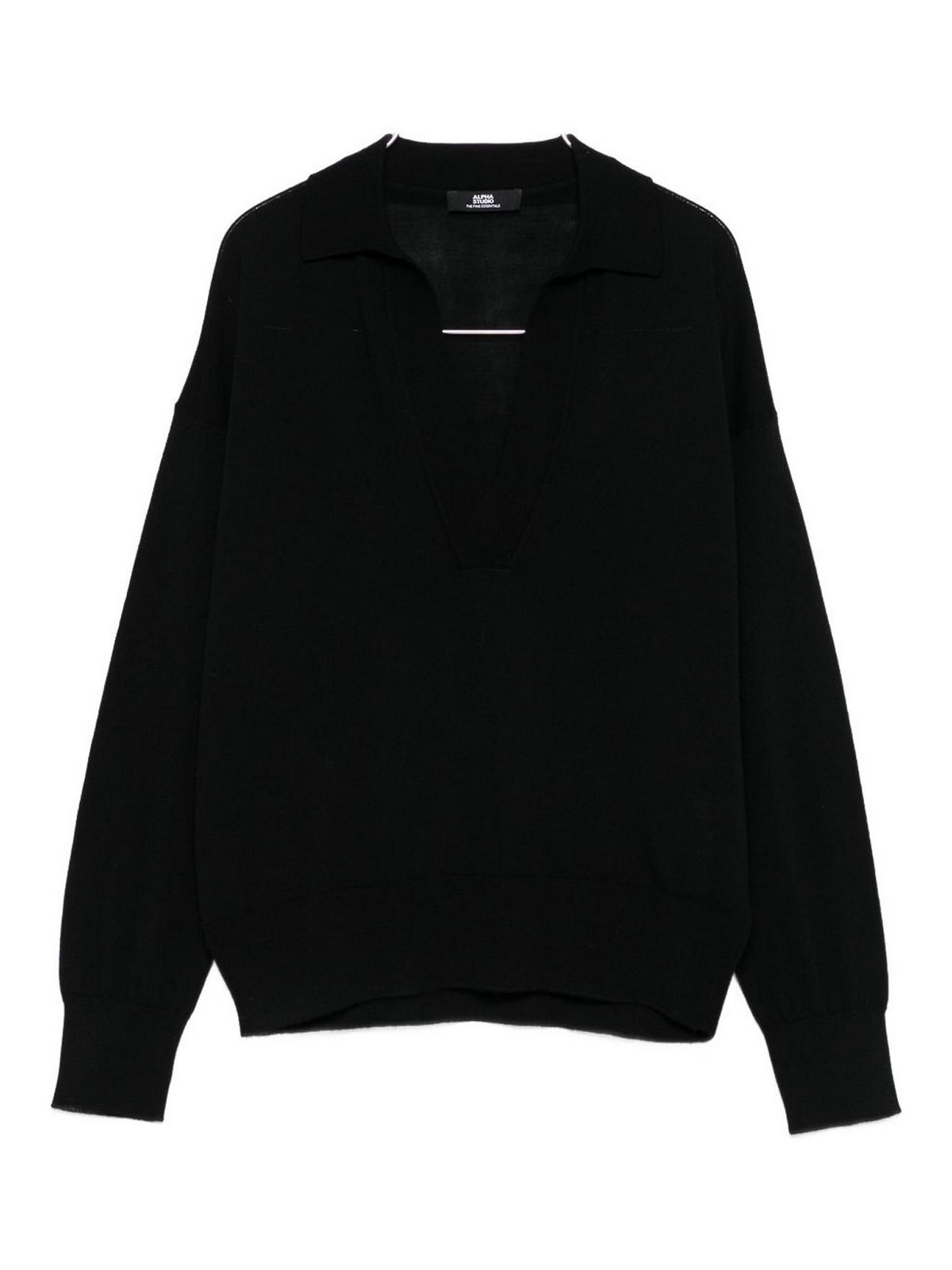 Col polo noir à col en V, manches longues, poignets et ourlet côtelés