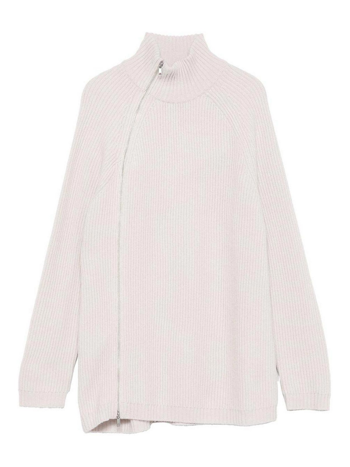 Blouson sportif blanc côtelé de la marque Alpha Studio, doté d'une double fermeture à glissière asymétrique, une pièce en maille contemporaine qui associe une texture raffinée à une attitude décontractée et sophistiquée.