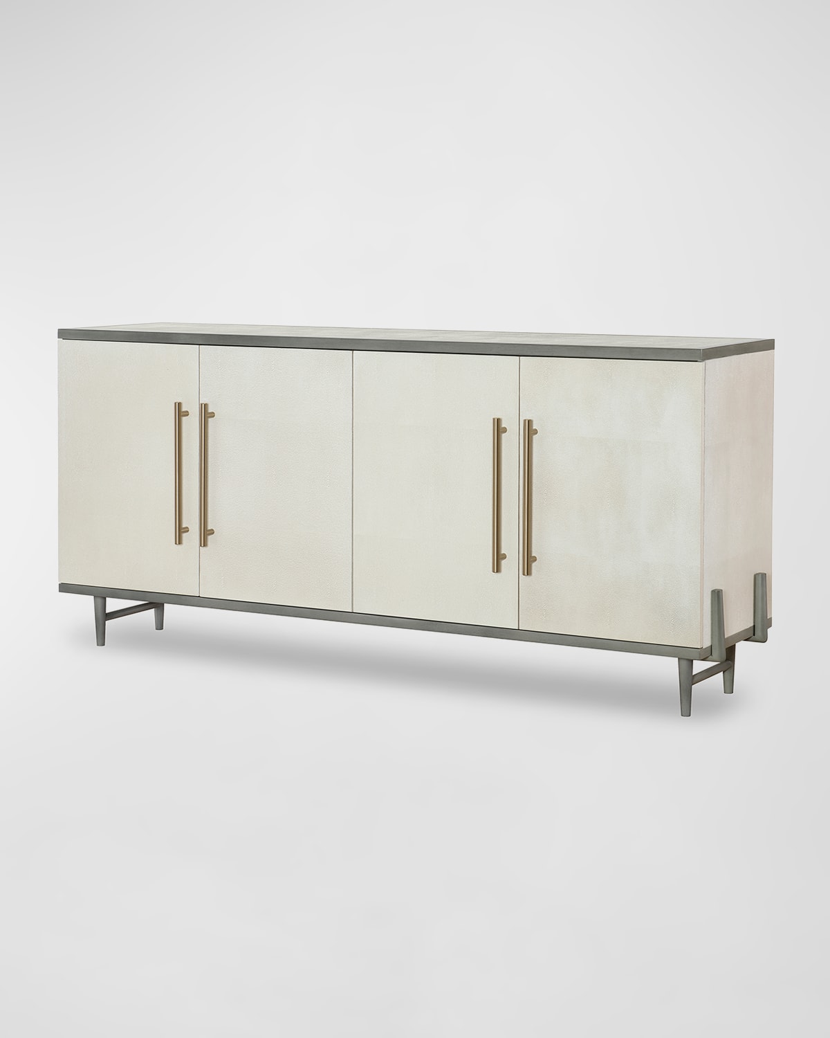 This fourdoor, faux shagreen (polyester vinyl) console is punctuated with an outline of ash greyfinished wood on the top and bottom. The case is raised on a wood cradle base and finished with brass hardware. Handcrafted of mahogany wood, mahogany veneer, vinyl, and brass Adjustable shelves included Overall, approx. 72"W x 19"D x 34"T Includes hardware Weight, 150.0 lbs Imported Boxed weight, approximately 162.0 lbs