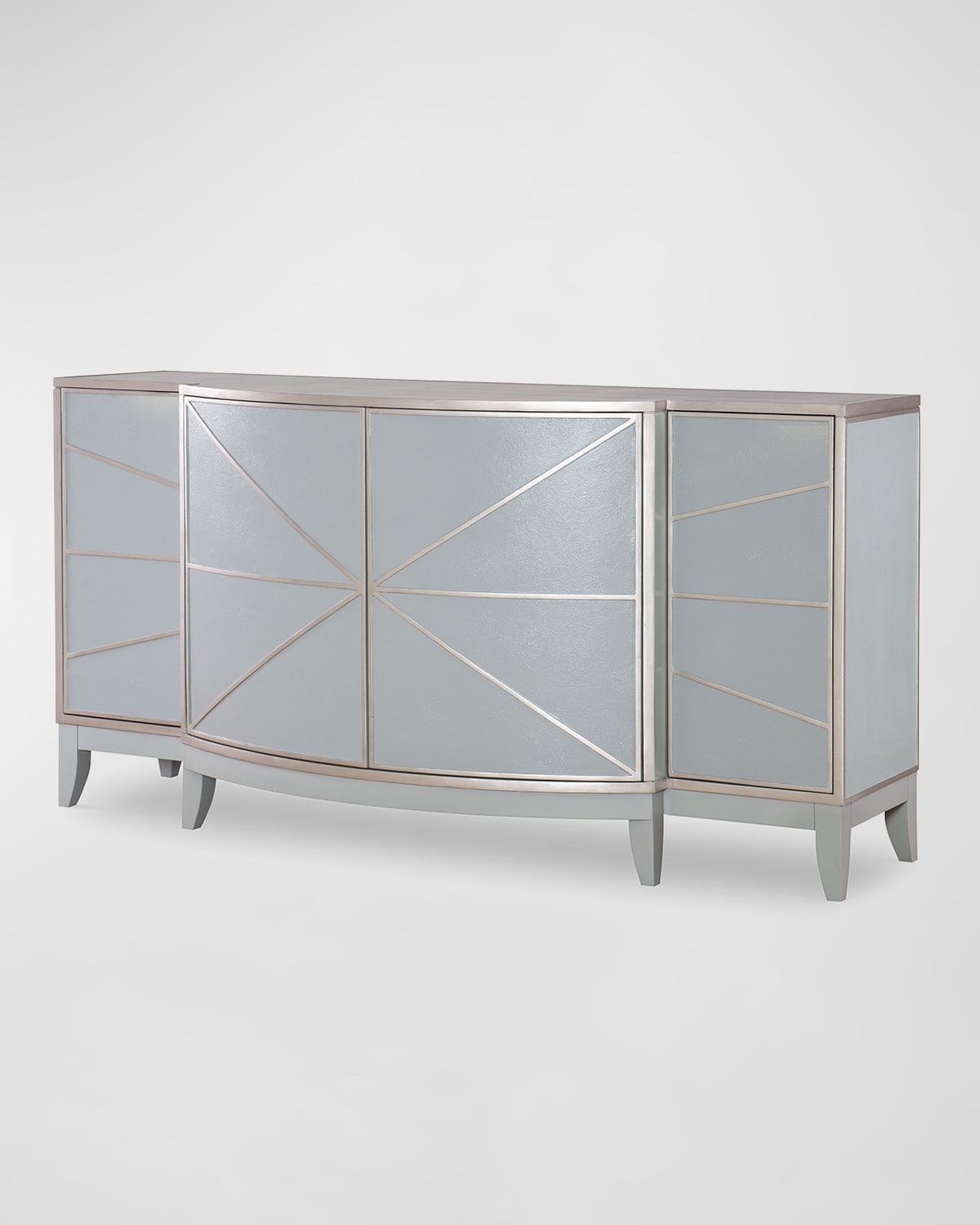 This credenza features a dramatic starburst on its doors, rendered in silver leaf and polar blue faux shagreen (polyvinyl) Touch latch doors Adjustable shelves Handcrafted of mahogany wood and mahogany veneers Overall, approx. 70"W x 24"D x 36"T Finished back Sold individually Imported Weight, 180.0 lbs Boxed weight, approximately 200.0 lbs