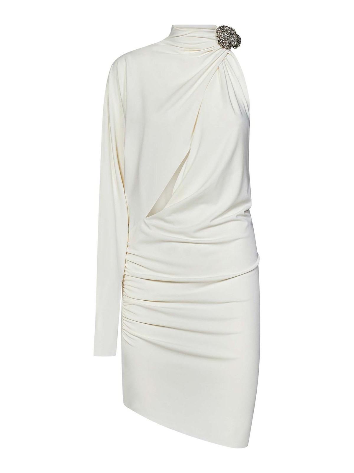 Col montant drapé à boutons latéraux avec bijou, découpe asymétrique sur une épaule, motif drapé sur la silhouette, ourlet asymétrique blanc