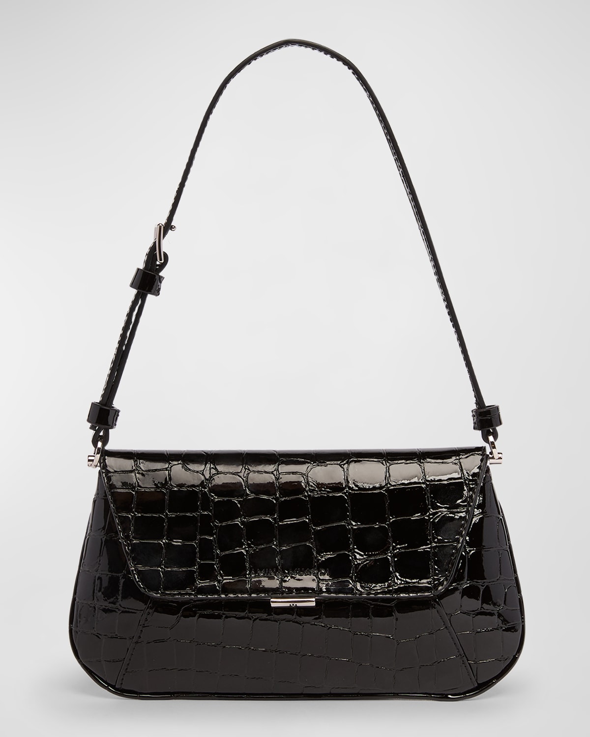 Amina Muaddi "Ami" shoulder bag in crocembossed calf leather Adjustable shoulder strap Framed top with liftclasp closure Interior, one card slot and mirror under top Lining: Leather Approx. 4.3"H x 8.3" x 1.2"D Item Weight (Lbs.): 2.1 Made in Italy