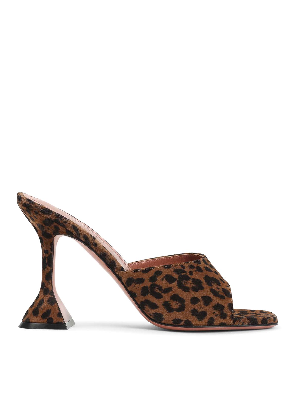 Pantoufles Amina Muaddi en lupita léopard, pantoufles en léopard pur, carrées, bout ouvert, dessus, bretelles ton sur ton, à enfiler, style sablier, talons ton sur ton