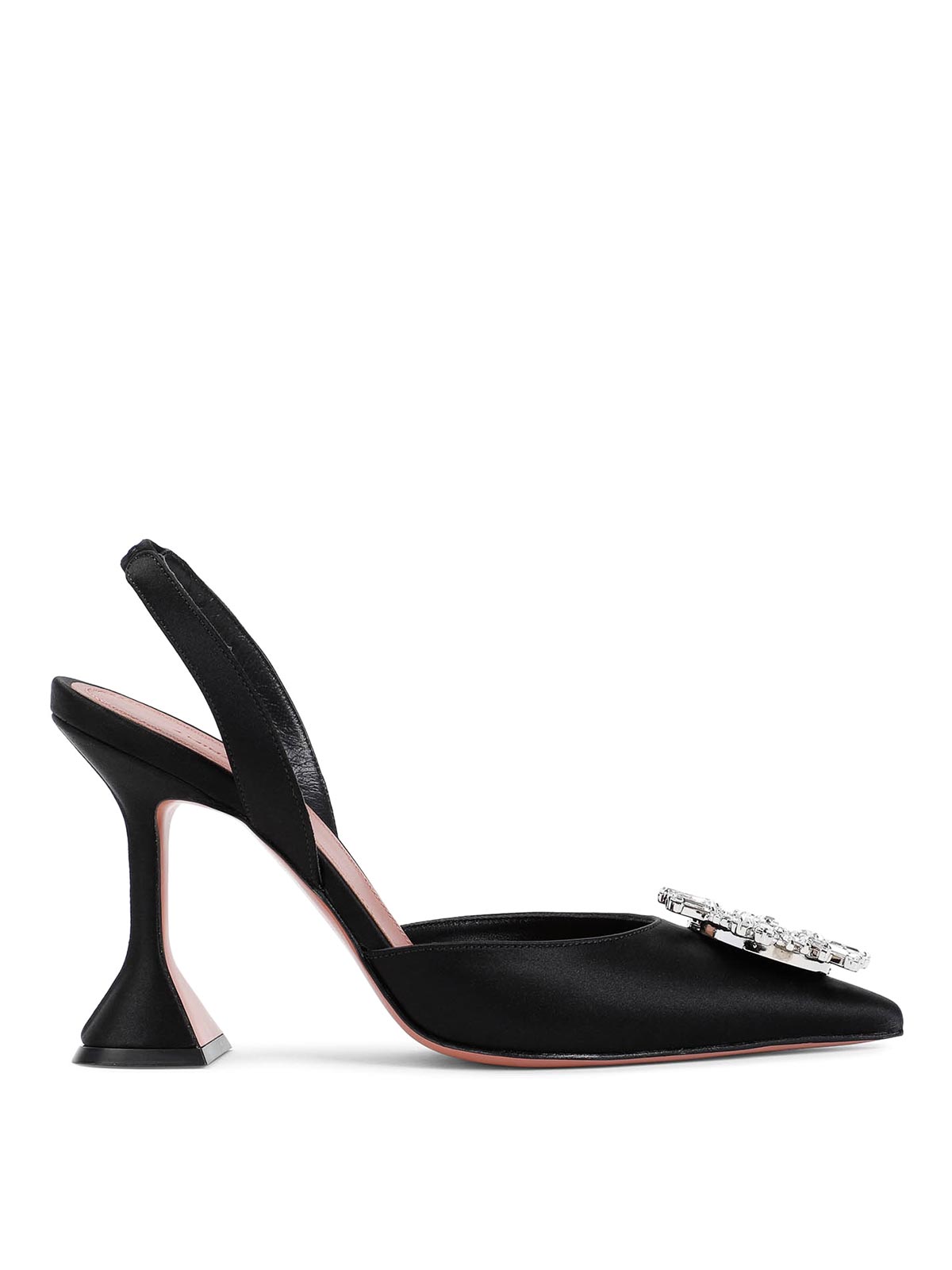 Sandale à bretelles Amina Muaddi en forme de bégum noire, sandale noire pure, bout pointu, boucle ton sur ton avec sablier