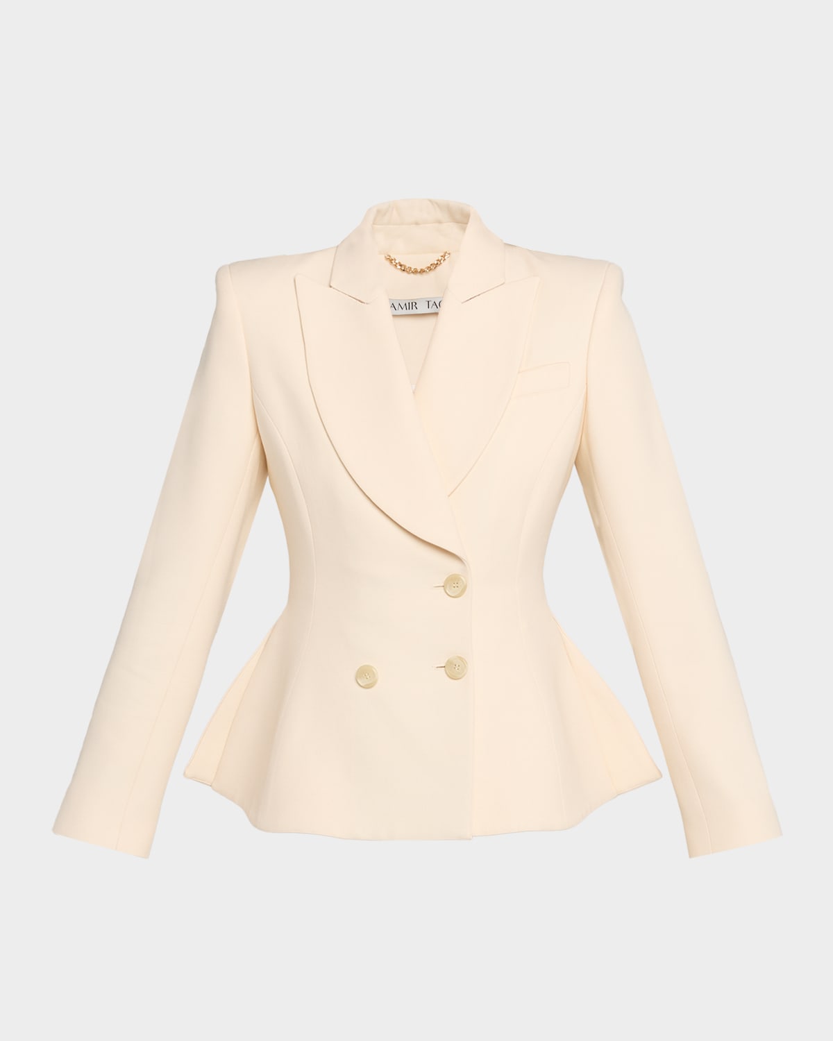 Amir Taghi "Dottie" blazer jacket is crafted of a wool crepe featuring a slim waist with a peplumlike flare hem Peak lapels; doublebreasted front Long sleeves; button cuffs Padded shoulders Chest welt pocket Slim fit Flare hem Hip length Walking vent back Wool Made in Italy