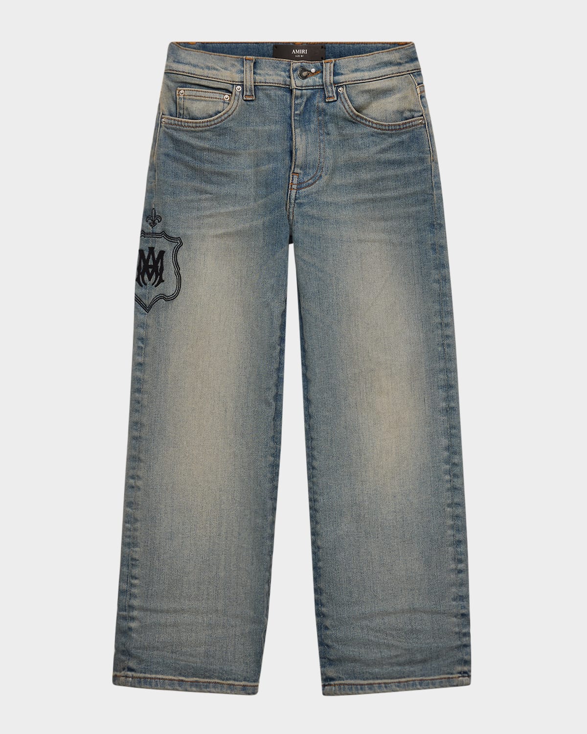 Amiri washed denim jeans finished with MA logo crest Fivepocket style Full length Straight legs Button/zip front closure Cotton/elastane/polyester Made in Italy