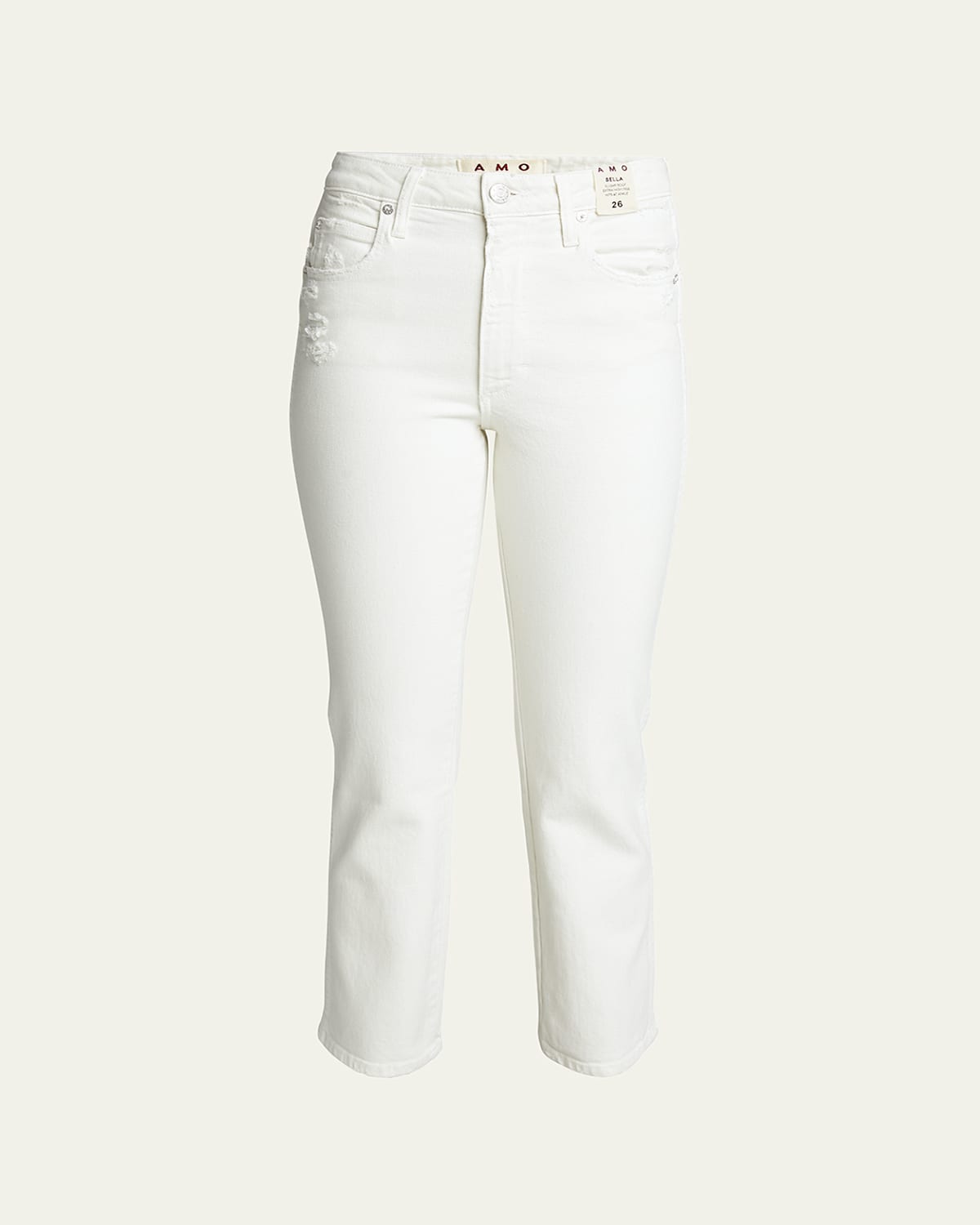 AMO Denim "Bella" jeans in stretch denim finished with a released hem Approx. 28" inseam High rise Button/zip fly; belt loops Fivepocket style Fitted through hip; flared from knee Cropped at the ankle Cotton/spandex/elastane Machine wash cold Made in USA from imported materials