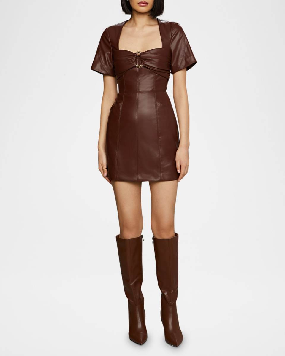 AMUR "Joey" slightly stretchy faux leather dress flaunts a golden irregular hardware ring on the bodice along with feminine ruching Approx. 34.8"L from shoulder to hem Sweetheart neckline Flared short sleeves Hem falls above the knee Bodycon fit Back zip closure Polyester Lining: Recycled polyester Dry clean Imported