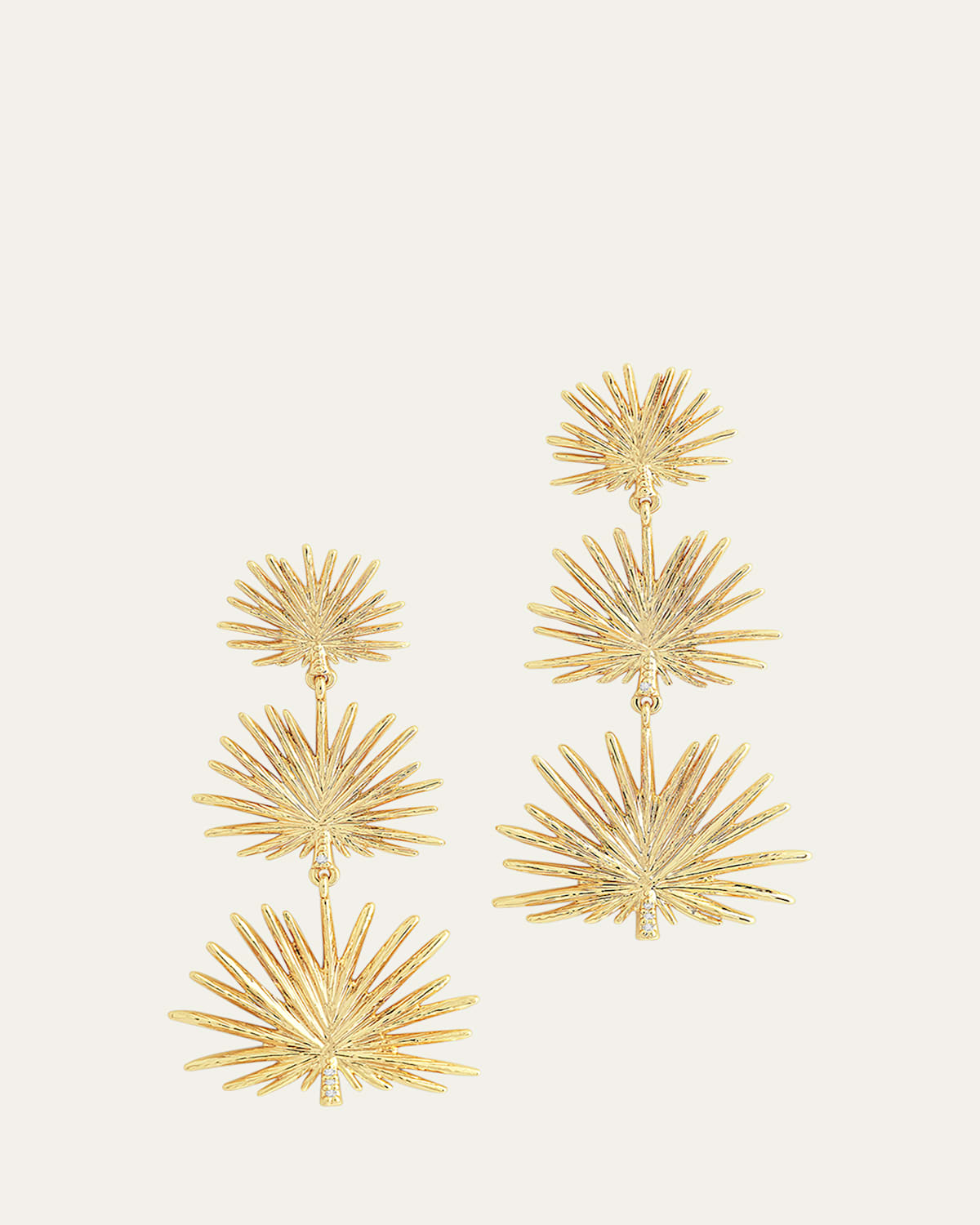 Anabel Aram Jewelry earrings Approx. 2" length x 1" width Handsculpted and textured 18karat golddipped brass Hinged palm leaves with handset crystals on the stems For pierced ears Imported Imported