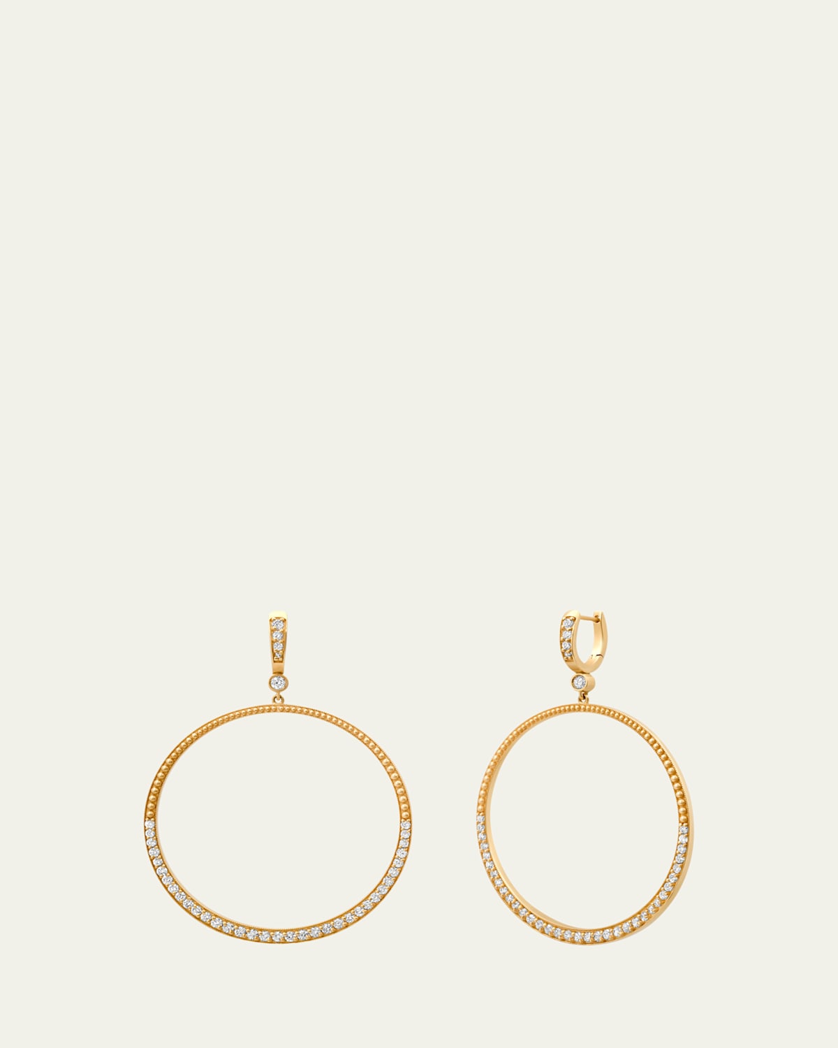 Polished hoop earrings 14karat yellow gold 2inch drop Total diamond carat weight: 1.2990 1/2" diameter Hinge backs for pierced ears Wipe clean