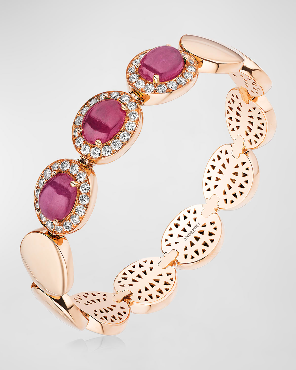 Andreoli stretch bracelet Polished 18karat rose gold Ruby cabochons with diamond halos 1.38 total diamond carat weight 7.57 total ruby carat weight Stretchy; slipon style Made in Italy